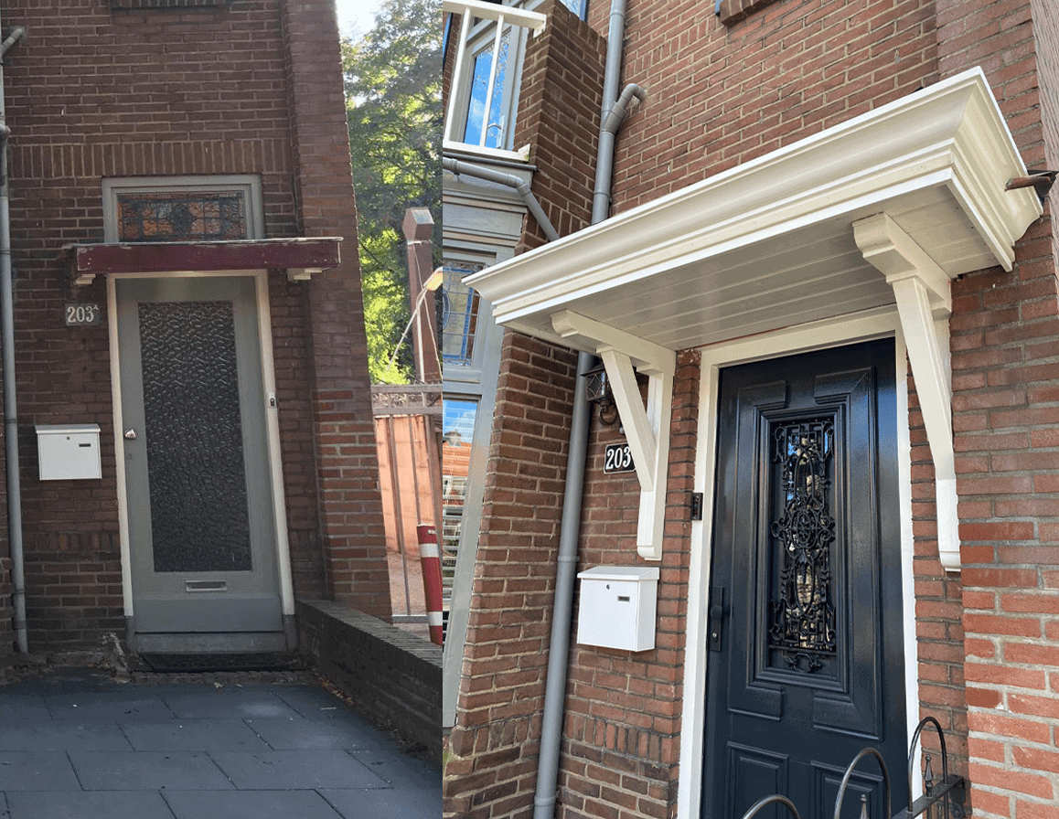 De oude deurluifel was al een tijdje een storende factor en deed geen recht aan de uitstraling van deze prachtige woning. Daarom hebben we de entree vernieuwd met onze deurluifel Kronenburg met trekstangen.